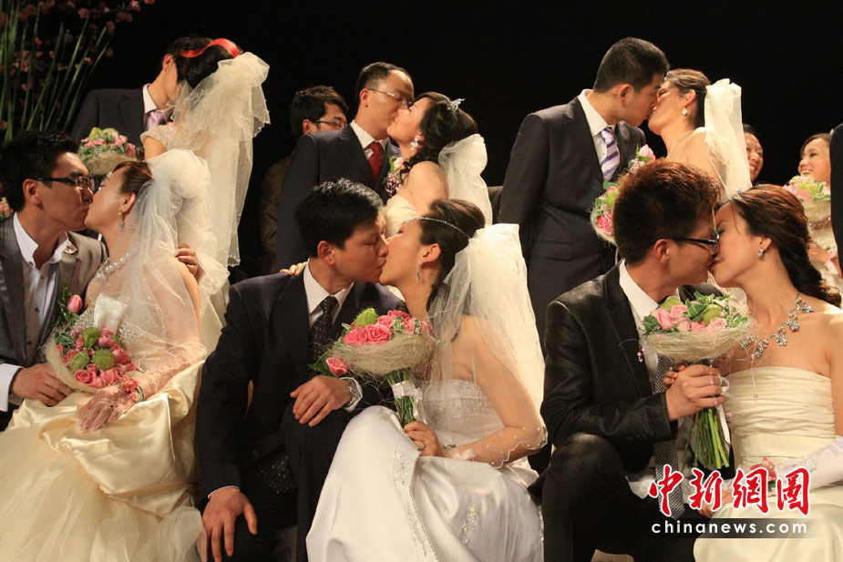 5月11日,35对新人来到世博法国馆内举行婚礼仪式。法国馆举行“法兰西浪漫婚典”的集体婚礼。中新社发 潘索菲 摄