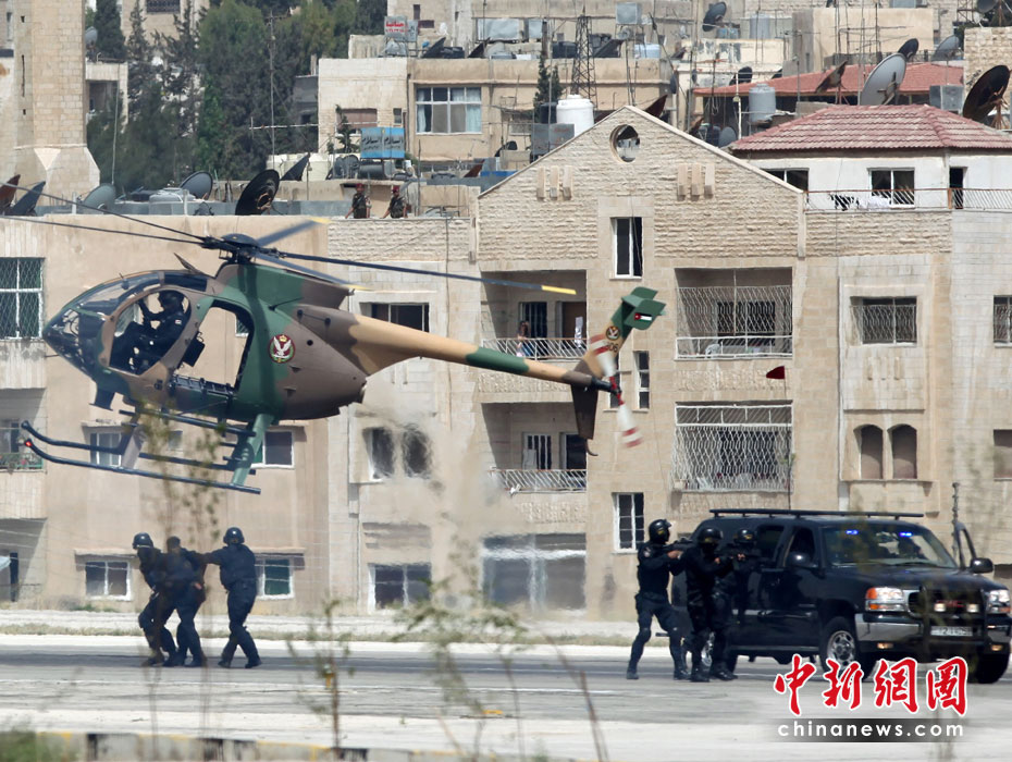 5月11日,约旦特种部队在安曼空军基地附近举行演习,为特种作战部队展览会(SOFEX)开幕式助兴。该展览会为期4天,展览主题包括国家安全及反恐措施。图片来源:中国新闻网