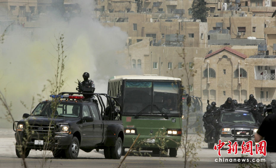 5月11日,约旦特种部队在安曼空军基地附近举行演习,为特种作战部队展览会(SOFEX)开幕式助兴。该展览会为期4天,展览主题包括国家安全及反恐措施。图片来源:中国新闻网
