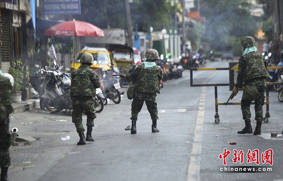 泰国政府军和反政府示威者5月14日深夜在曼谷爆发严重暴力冲突。曼谷紧急医疗机构15日称,截止当地时间早晨6时,冲突已导致16人死亡,至少141受伤,伤者中包括3名外国人。图片来源:中国新闻网