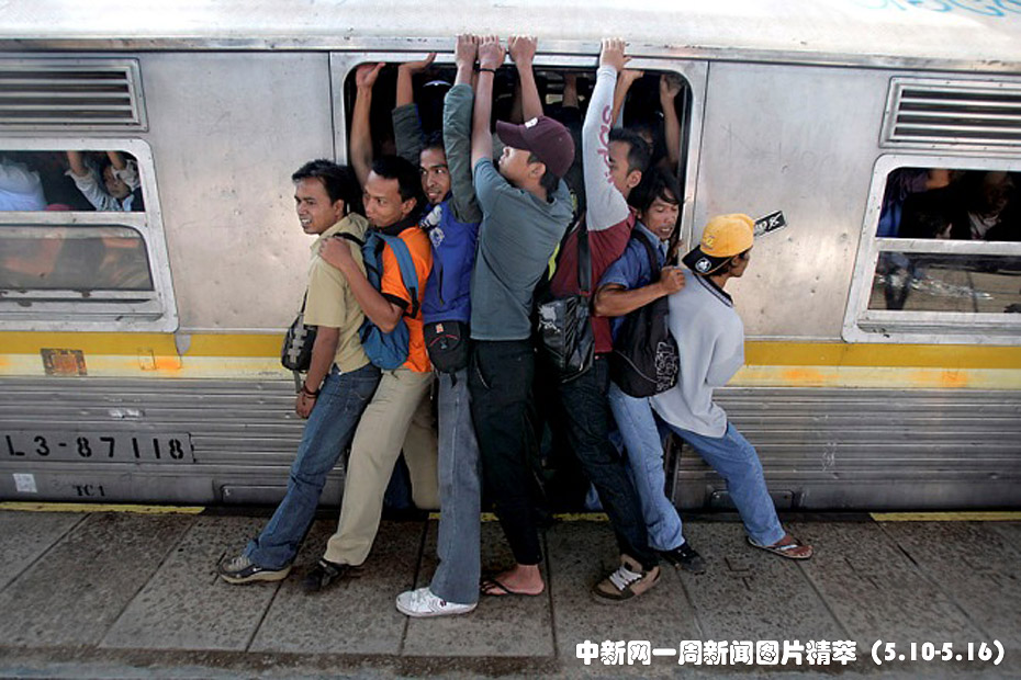 周二(11日),在印度尼西亚雅加达火车站,人们奋力挤入拥挤的市郊火车。