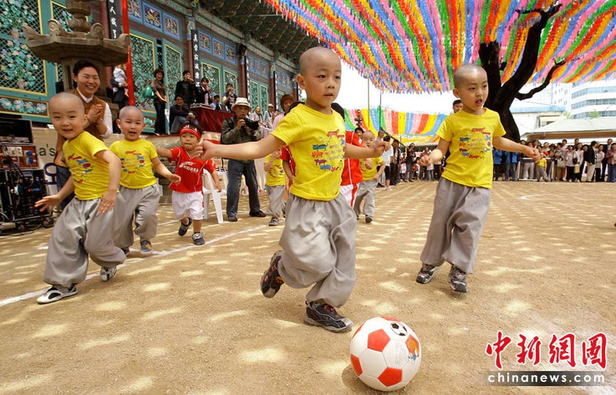 2010年5月15日,韩国首尔曹溪寺院举行了儿童足球赛,一群四五岁的孩子和小和尚参加了这场足球友谊赛。这场比赛是佛诞节活动的一部分,也是为了迎接2010世界杯足球赛的到来。Chung Sung-Jun