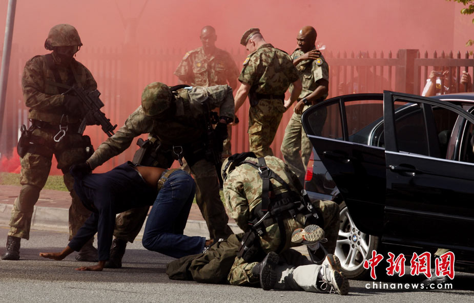 5月17日,南非约翰内斯堡,警察举行防暴演习,为下个月举行的世界杯做准备。 图片来源:中国新闻网
