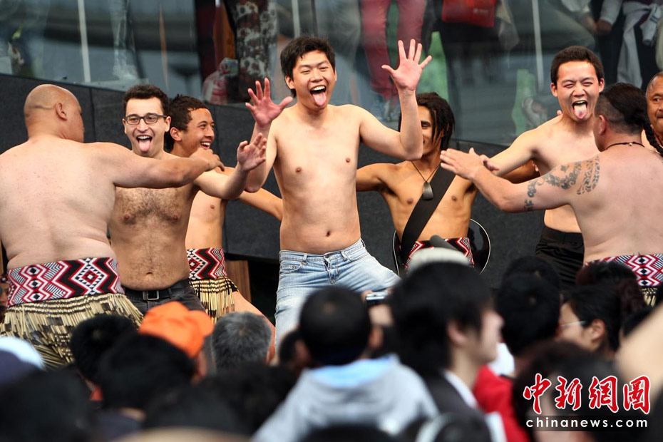 5月初,游客在上海世博会新西兰馆前赤膊上阵学跳毛利舞。中新社记者 杜洋 摄