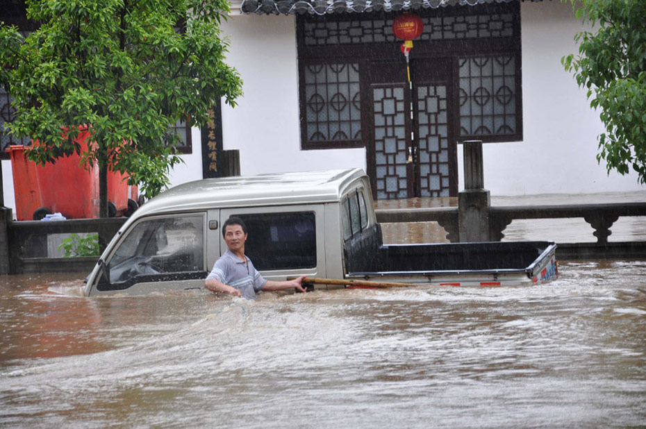 2010年5月18日,江西婺源遭受暴雨洪涝灾害,在婺源县城,一辆汽车和车主被洪水围困。单长华 摄 (图片来源:新华网)