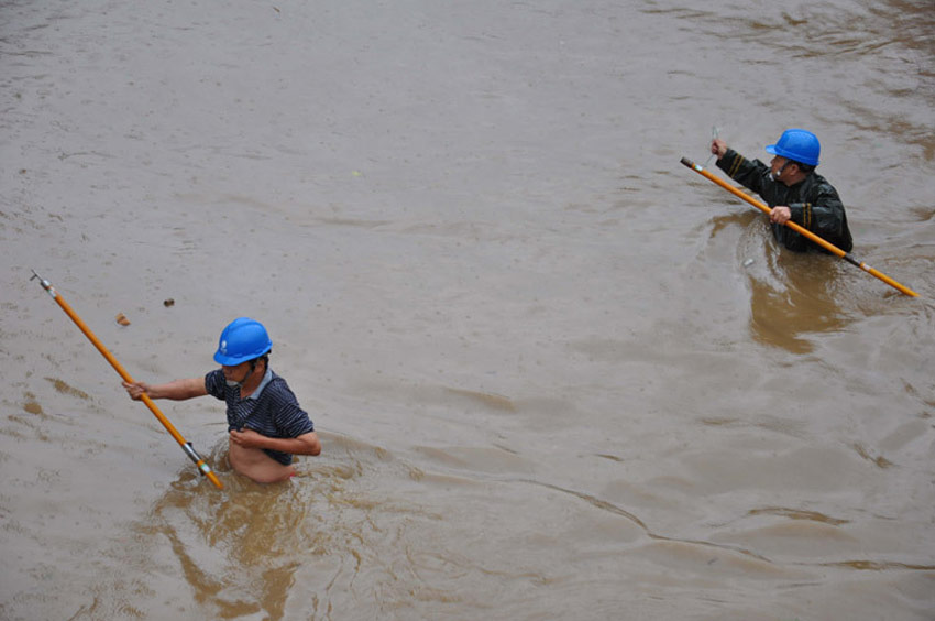 5月18日,婺源县两名电力工人走在齐腰深的洪水中。单长华 摄 (图片来源:新华网)