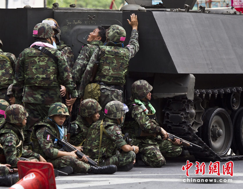 19日清晨,数百名军警在武装车辆的掩护下向反政府示威者在曼谷的大本营聚集。自上周四红衫军与政府在曼谷爆发冲突以来,已经导致39人死亡,数百人受伤。
