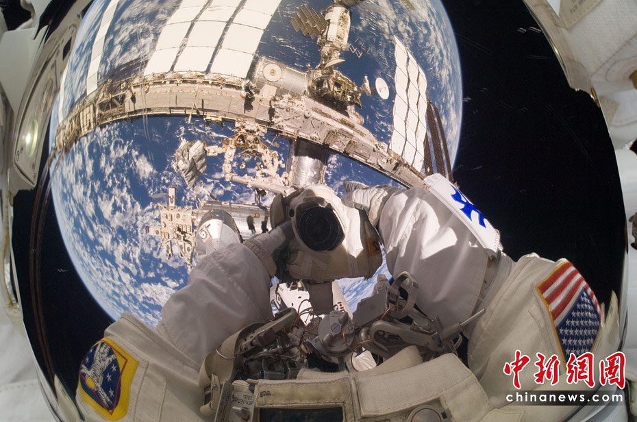 美国当地时间5月17日,“亚特兰蒂斯”号航天飞机宇航员加雷特·赖斯曼和史蒂夫·鲍恩进行了与国际空间站对接后的首次太空行走。图片来源:中国新闻网