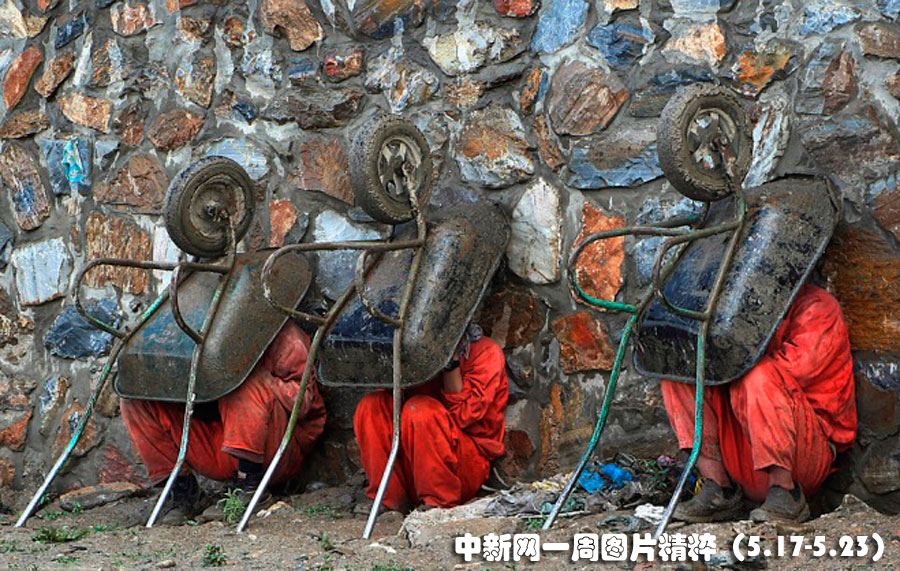 5月18日,阿富汗喀布尔发生了一起自杀式袭击。图为被雇来去清理废墟的工人在独轮小推车下避雨。