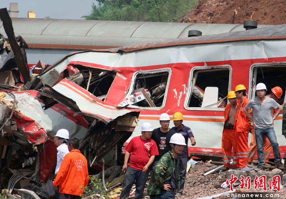 5月23日下午14时,距离沪昆铁路客运列车脱线事发已经12小时,近万名武警、消防、医护、交警、特警仍在事故现场紧急救援,被埋车厢已经清理完毕,由于车厢受到严重挤压,里面可能还有遇难者遗体尚未取出。中新社发 艾永全 摄