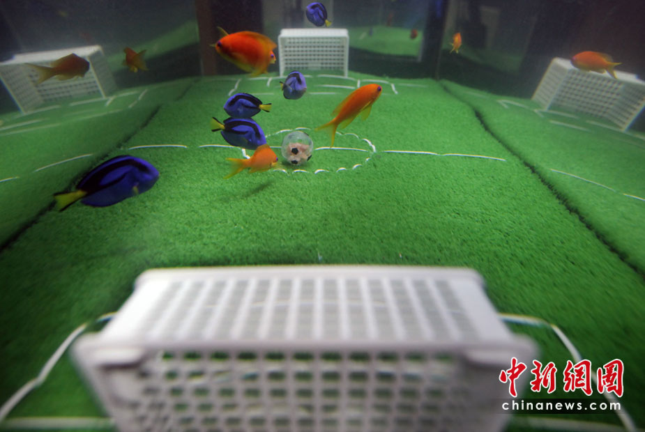 5月23日,日本横滨八景岛海洋世界水族馆中,一群鱼儿在“踢足球”,蓝色鱼代表日本队,橘色鱼代表荷兰队。在2010年南非“世界杯”上,日本将迎战荷兰队。