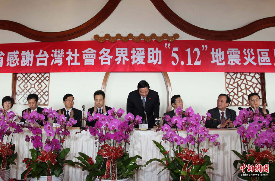 5月24日下午,“四川省感谢台湾社会各界援助‘5.12’地震灾区见面会”在台北圆山饭店举行,首度访台的中共四川省委书记刘奇葆于致辞时,两度鞠躬感谢台湾同胞积极援助四川灾区,展现出血浓于水的同胞大爱。 中新网记者董会峰摄