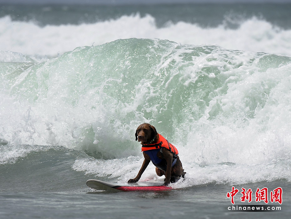 5月22日,美国加利福尼亚州圣迭戈举行了一场妙趣横生的狗狗冲浪比赛。图片来源:中国新闻网