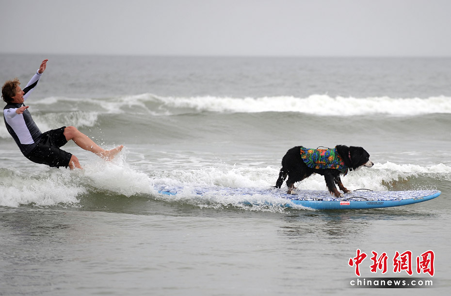 5月22日,美国加利福尼亚州圣迭戈举行了一场妙趣横生的狗狗冲浪比赛。图片来源:中国新闻网