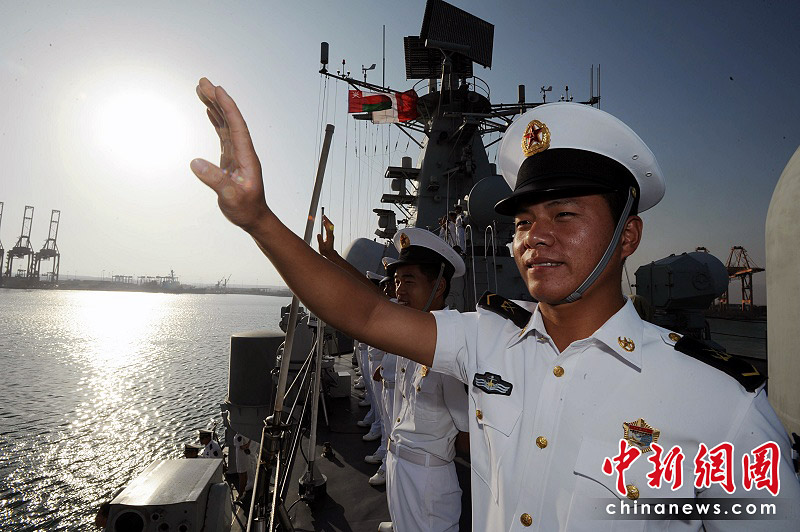 护航官兵向前来迎接的中国驻阿曼使馆官员、海军先遣组成员、中远西亚公司员工等人群挥手致意。江山 摄