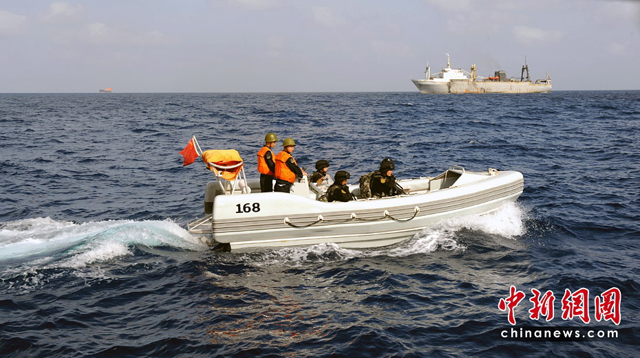 图为特战队员从“广州”舰换乘小艇到商船的情景。江山 摄