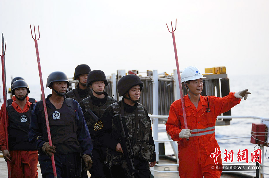 早晨和黄昏是海盗高发时段,特战队员与“嘉永山”轮反海盗小组联合巡逻警戒。江山 摄