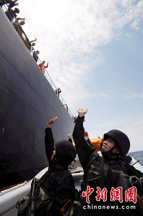 4月16日当地时间11时,第五批护航编队圆满完成第188批护航任务,在“嘉永山”轮船实施随船护卫的4名特战队员换乘小艇离开时,船员纷纷来到甲板与他们挥手告别。江山 摄