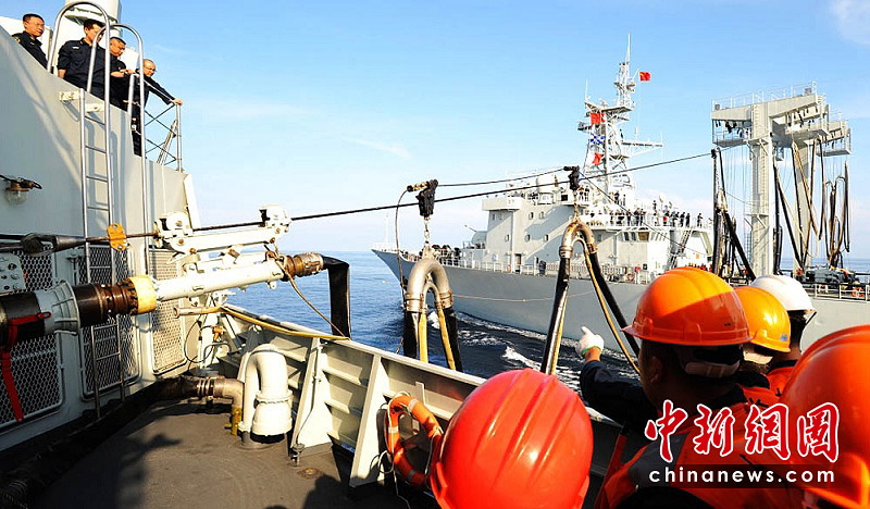 3月9日上午,第五批护航编队在印度洋进行了首次海上补给。“微山湖”综合补给舰对“广州”号导弹驱逐舰进行了横向的液货补给。江山 摄