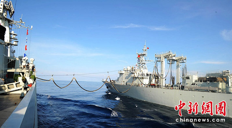 3月9日上午,第五批护航编队在印度洋进行了首次海上补给。“微山湖”综合补给舰对“广州”号导弹驱逐舰进行了横向的液货补给。江山 摄