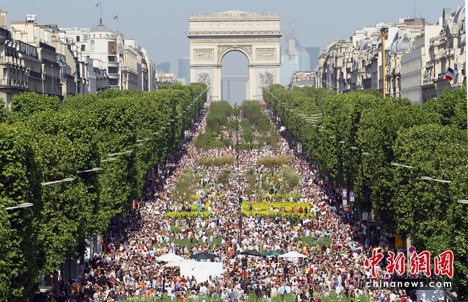 5月24日,法国总统萨科齐和妻子布吕尼参观在法国巴黎举行的“自然首都”展。该项展览是由街头艺术家加德·魏尔联手法国“青年农民协会”和林业协会共同发起的的,将百余种农作物、树木和动物“齐聚”法国首都巴黎的香榭丽舍大街,令这条“香街”变身“绿色的自然世界”。图片来源:中国新闻网