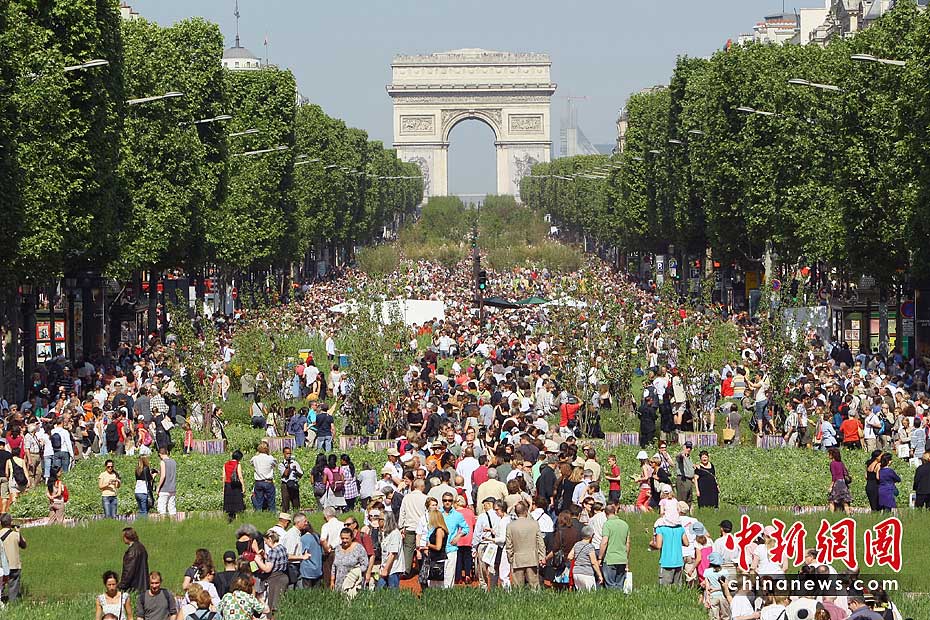 5月24日,法国总统萨科齐和妻子布吕尼参观在法国巴黎举行的“自然首都”展。该项展览是由街头艺术家加德·魏尔联手法国“青年农民协会”和林业协会共同发起的的,将百余种农作物、树木和动物“齐聚”法国首都巴黎的香榭丽舍大街,令这条“香街”变身“绿色的自然世界”。图片来源:中国新闻网