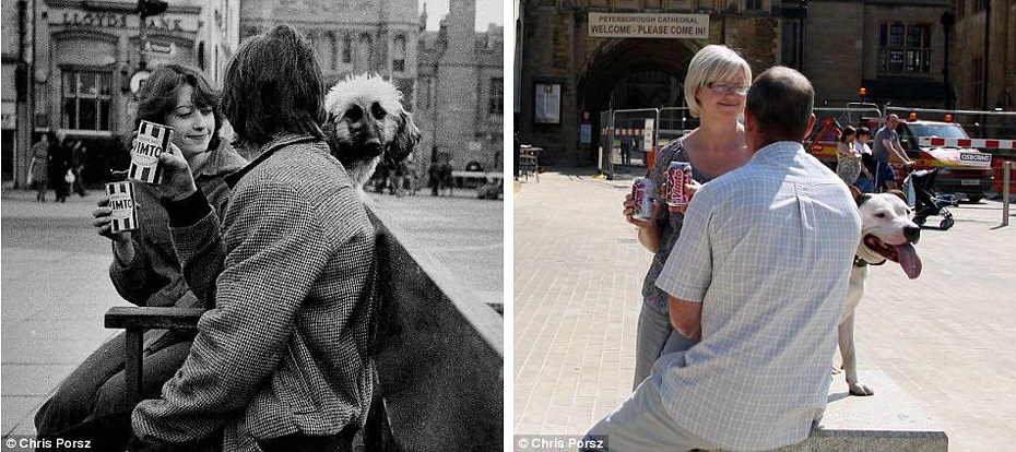 朱迪和戴夫在广场的长椅上边小憩边喝冷饮,当时二人正在庆祝朱迪的21岁生日。30年过去了,他们已经是3个孩子的父母,身边的宠物狗换了一条,夫妻俩的感情还是那么深厚。