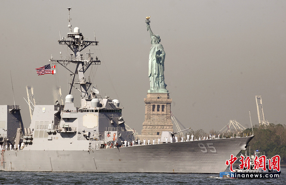 当地时间5月26日,美国第23届纽约舰队周开幕,包括“硫磺岛”号两栖攻击舰在内的11艘参加舰队周活动的军舰由南向北在哈得孙河面上游弋。纽约民众将以停靠在曼哈顿哈得孙河86号码头的“无畏号”航母博物馆为中心,展开为期一周的庆祝和纪念活动。图片来源:中国新闻网