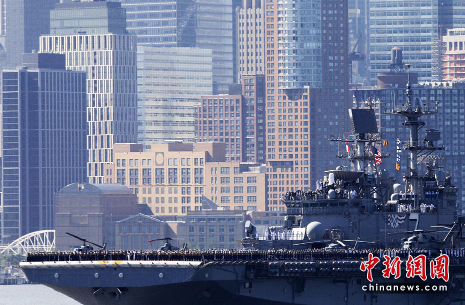 当地时间5月26日,美国第23届纽约舰队周开幕,包括“硫磺岛”号两栖攻击舰在内的11艘参加舰队周活动的军舰由南向北在哈得孙河面上游弋。纽约民众将以停靠在曼哈顿哈得孙河86号码头的“无畏号”航母博物馆为中心,展开为期一周的庆祝和纪念活动。图片来源:中国新闻网