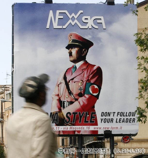 近日,意大利西西里首府巴勒莫街头随处可见一款备受争议的海报——臭名昭著的纳粹头子希特勒化身“粉红男郎”,纳粹军服胳膊上的纳粹符号被大大的粉色心形图案代替。图片来源:中国新闻网>>点击观看详细内容