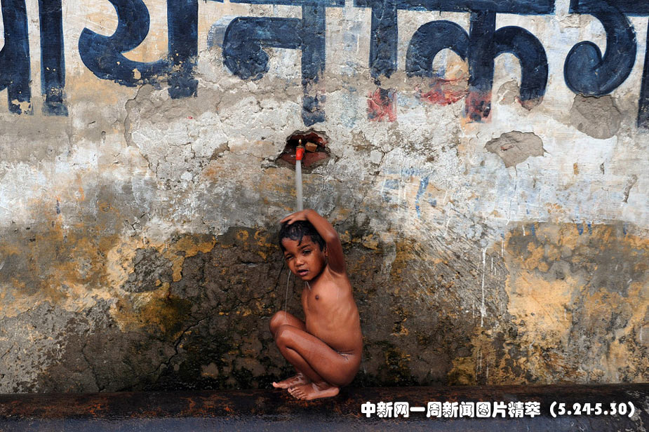 27日(周四),一名印度儿童在水管下冲洗,抵抗炎热。