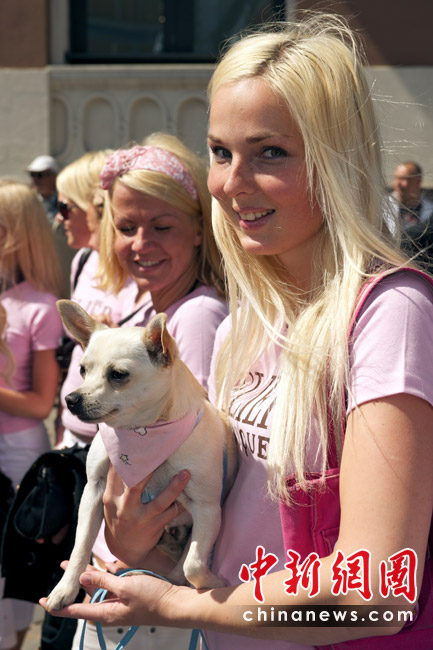 5月29日,在拉脱维亚首都里加,众多金发美女身着艳丽装扮在街头游行,大秀妩媚身材。