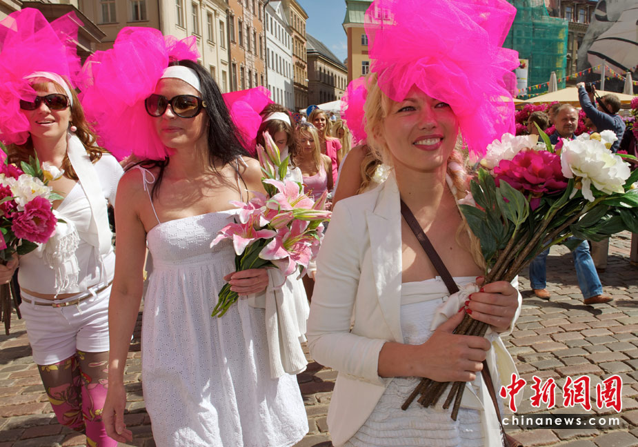 5月29日,在拉脱维亚首都里加,众多金发美女身着艳丽装扮在街头游行,大秀妩媚身材。