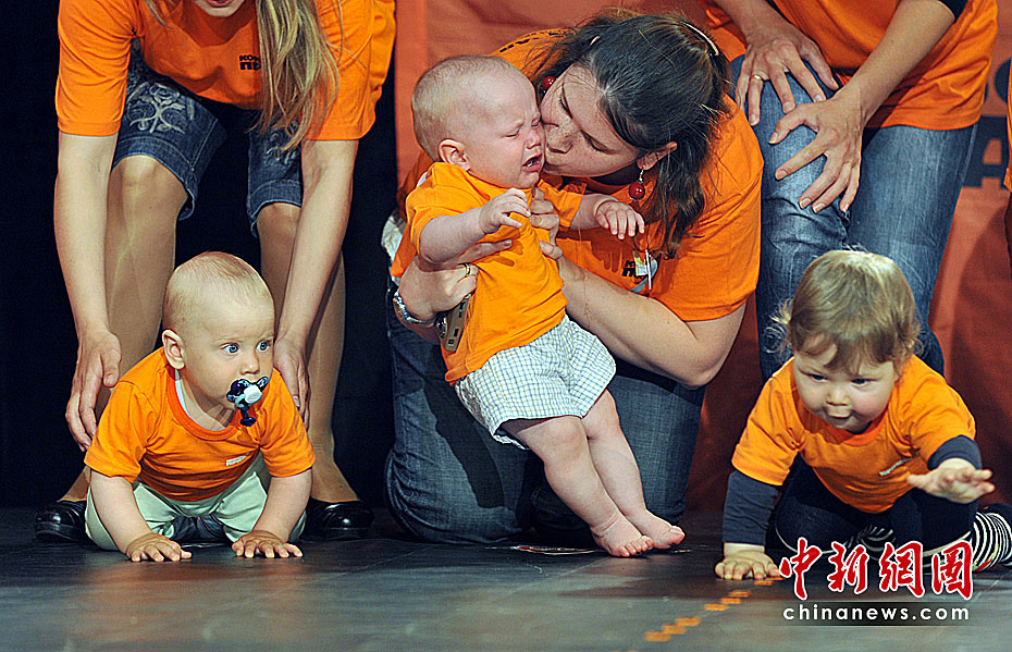 当地时间5月31日,乌克兰基辅举行了宝宝爬行大赛。数十名婴儿在母亲的鼓励下奋力向4米外的终点爬去。图片来源:中国新闻网
