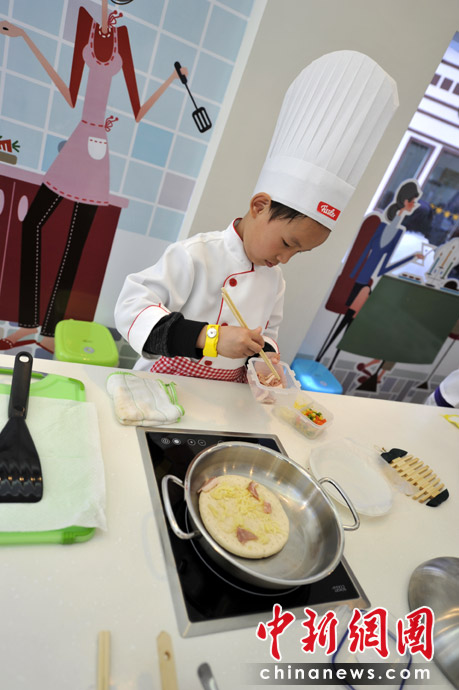 图为“小厨师”在做批萨。 中新网记者 王红纲 摄