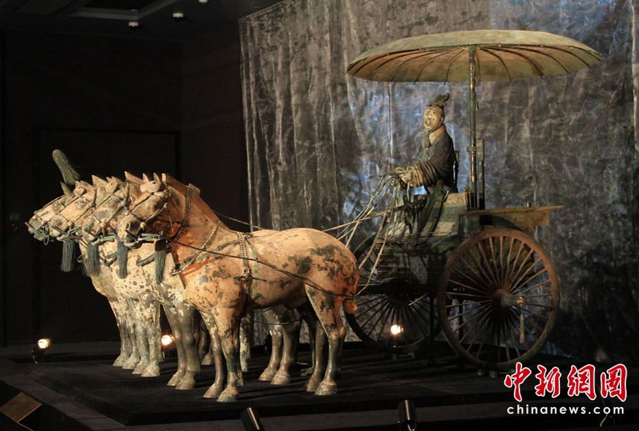 6月1日,秦始皇帝陵出土的“一号铜车马”亮相世博会中国国家馆,这是它出土30年以来第一次“驶出”陕西。这件国宝级文物在地下历经了2200多个春秋,于1980年出土,通体彩绘,为双轮,单辕,驷马系驾,总重约1061公斤。铜车马共由3500多个零件组成,除一些金、银饰件外,其余全部为青铜铸件。中新社记者 殷春永 摄