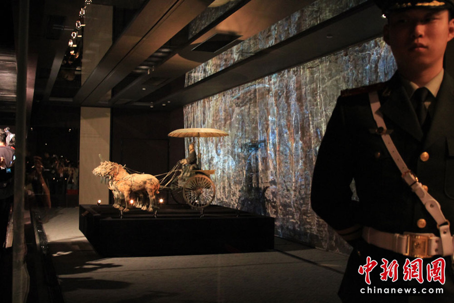 6月1日,秦始皇帝陵出土的“一号铜车马”亮相世博会中国国家馆,这是它出土30年以来第一次“驶出”陕西。这件国宝级文物在地下历经了2200多个春秋,于1980年出土,通体彩绘,为双轮,单辕,驷马系驾,总重约1061公斤。铜车马共由3500多个零件组成,除一些金、银饰件外,其余全部为青铜铸件。中新社记者 殷春永 摄