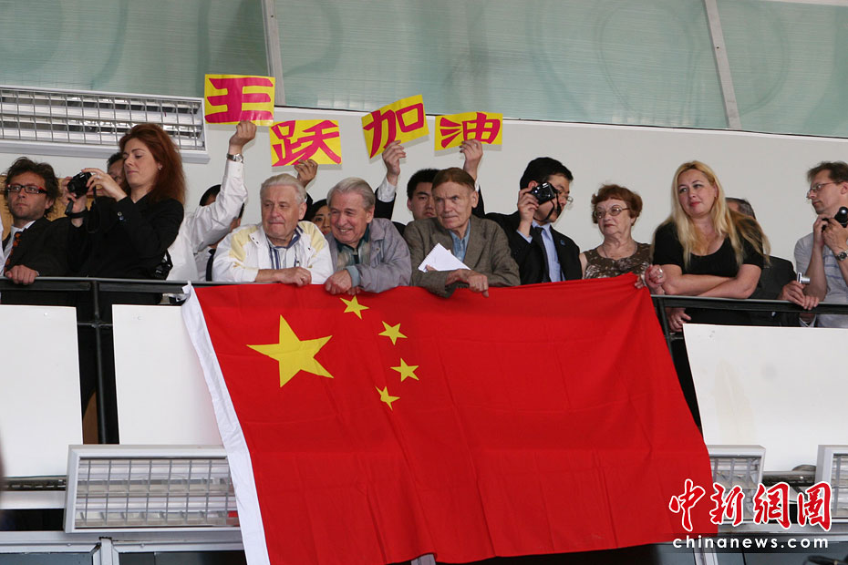 当地时间6月3日14时,“火星-500”实验舱最后一道舱门关闭,人类历史上首次模拟火星载人航天飞行试验就此拉开帷幕。中国参试项目团队现场为王跃加油。中新社记者 田冰 摄