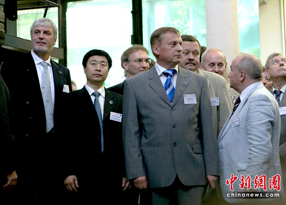当地时间6月3日14时,“火星-500”实验舱最后一道舱门关闭,人类历史上首次模拟火星载人航天飞行试验就此拉开帷幕。图为中国航天员科研训练中心副主任白延强(左二)在进舱仪式上。中新社记者 田冰 摄