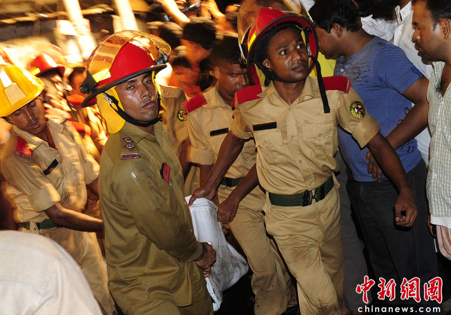 6月3日,孟加拉国首都达卡夜间发生一起重大火灾,到目前为止已造成至少87人死亡,上百人受伤。图为火灾现场消防员抬出一具遇难者遗体。图片来源:中国新闻网
