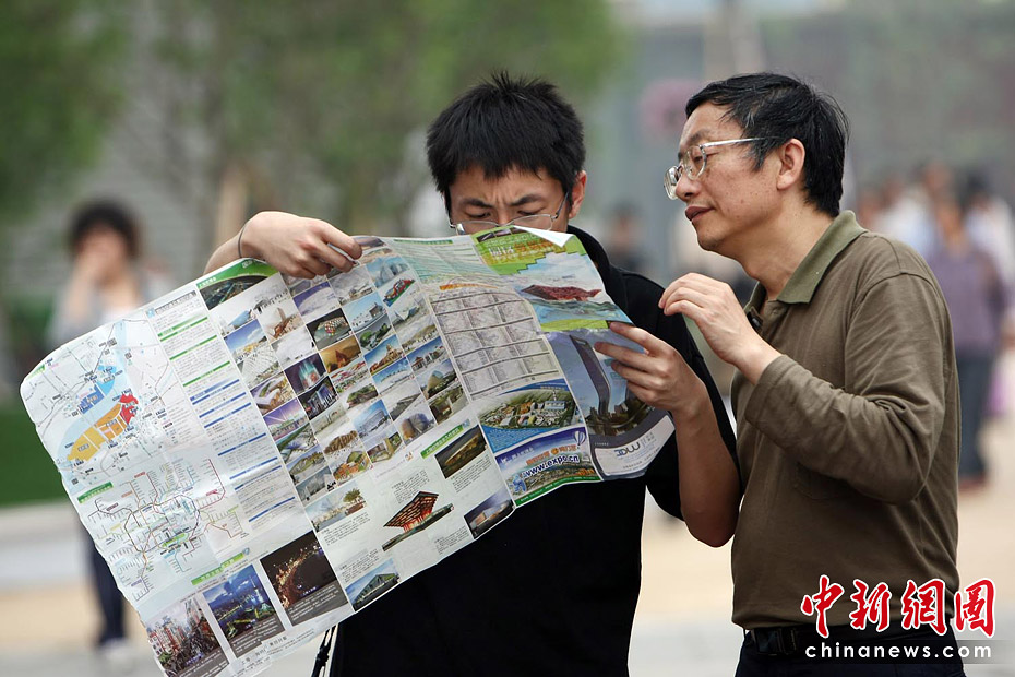 截至6月5日19点30分,上海世博会累计参观者已超过1000万人次。据悉,上海世博会的规划用地为5.28平方公里,约242个国家和国际组织参展分布在浦东和浦西两大区域。要想在这么大的地方找到自己想去的地方,那么世博地图就是必须的装备。图为上海世博园内游客正在地图上寻找自己要去的地方。中新社记者 杜洋 摄