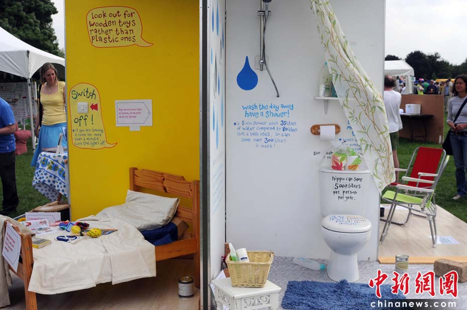 当地时间2010年6月6日,英国伦敦举行卡姆登绿色市集(Camden Green Fair),这是英国伦敦每年环保领域的“重头戏”。本届市集的主旨是要唤起大众对环境问题的关注,选择更加可持续发展的生活方式。据活动主办方预计,本届市集将吸引来自英国各地和世界各国的2万多人参加。图为“家”的模型,共分为四部分:客厅、儿童卧室、卫生间、 厨房。设计的每个小细节都体现出设计者“让生活更美好”的理念。Fiona/摄 Fiona 马小刚/文
