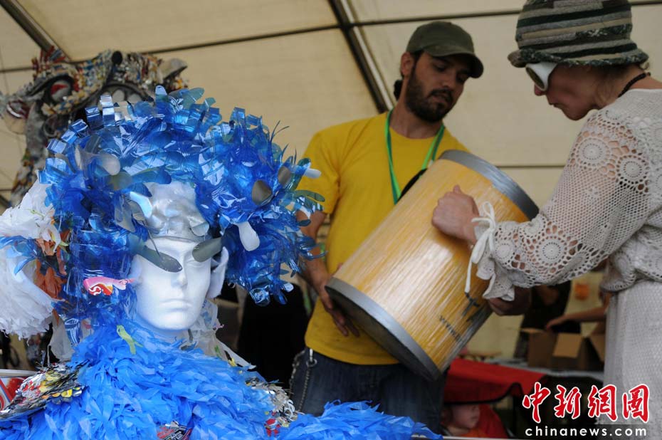 当地时间2010年6月6日,英国伦敦举行卡姆登绿色市集(Camden Green Fair),这是英国伦敦每年环保领域的“重头戏”。本届市集的主旨是要唤起大众对环境问题的关注,选择更加可持续发展的生活方式。据活动主办方预计,本届市集将吸引来自英国各地和世界各国的2万多人参加。图为艺术家们用回收的塑料制品制作的时尚作品。仔细看还能找到“品客薯片”包装的细微痕迹。Fiona/摄 Fiona 马小刚/文