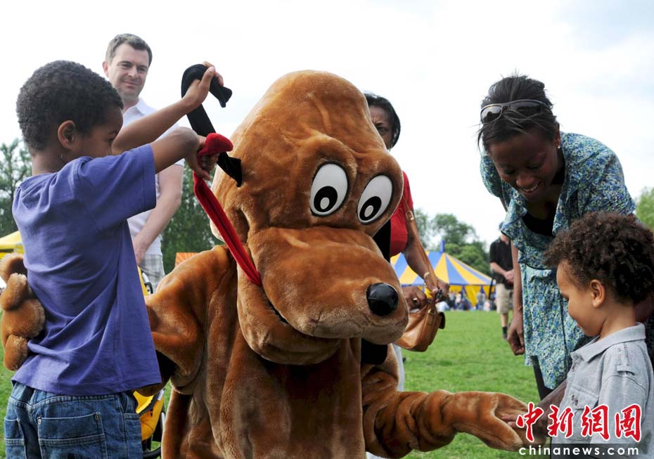 当地时间2010年6月6日,英国伦敦举行卡姆登绿色市集(Camden Green Fair),这是英国伦敦每年环保领域的“重头戏”。本届市集的主旨是要唤起大众对环境问题的关注,选择更加可持续发展的生活方式。据活动主办方预计,本届市集将吸引来自英国各地和世界各国的2万多人参加。图为由工作人员扮成的卡通狗总会引来许多孩子。Fiona/摄 Fiona 马小刚/文