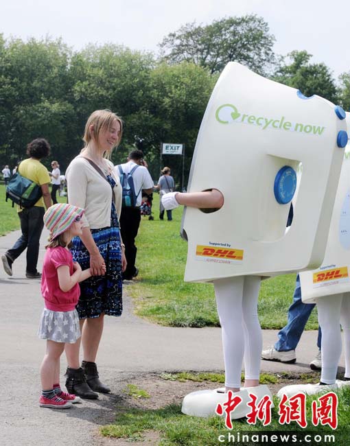 当地时间2010年6月6日,英国伦敦举行卡姆登绿色市集(Camden Green Fair),这是英国伦敦每年环保领域的“重头戏”。本届市集的主旨是要唤起大众对环境问题的关注,选择更加可持续发展的生活方式。据活动主办方预计,本届市集将吸引来自英国各地和世界各国的2万多人参加。图为志愿者穿着电水壶模型向游客讲解回收废旧家用电器的重要性,号召人们从节约资源、防止化学污染两方面考虑都要尽量回收废弃的家用电器。Fiona/摄 Fiona 马小刚/文