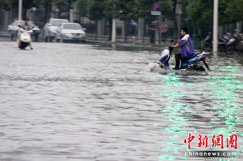6月8日,在江西瑞昌市街头,行人在积水中艰难前行。自6月7日夜间开始,江西九江市持续遭受暴雨袭击,各县、区24小时的平均降雨量在80毫米左右,最大降雨量在庐山区达到134毫米。魏东升 胡国林/CFP