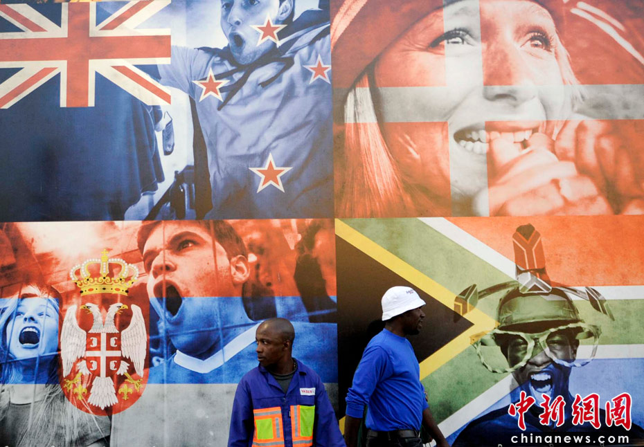 当地时间6月9日,民众在南非约翰内斯堡街头的世界杯宣传画前,非洲大陆即将首次迎来足球世界杯。中新社发 廖攀 摄