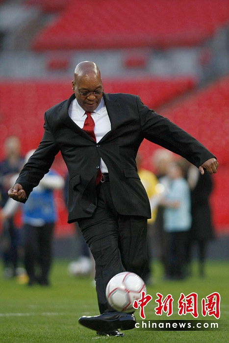 图为2010年3月4日,英国伦敦,正在英国访问的南非总统祖马到温布利大球场球场参观,并展示了他的球技。