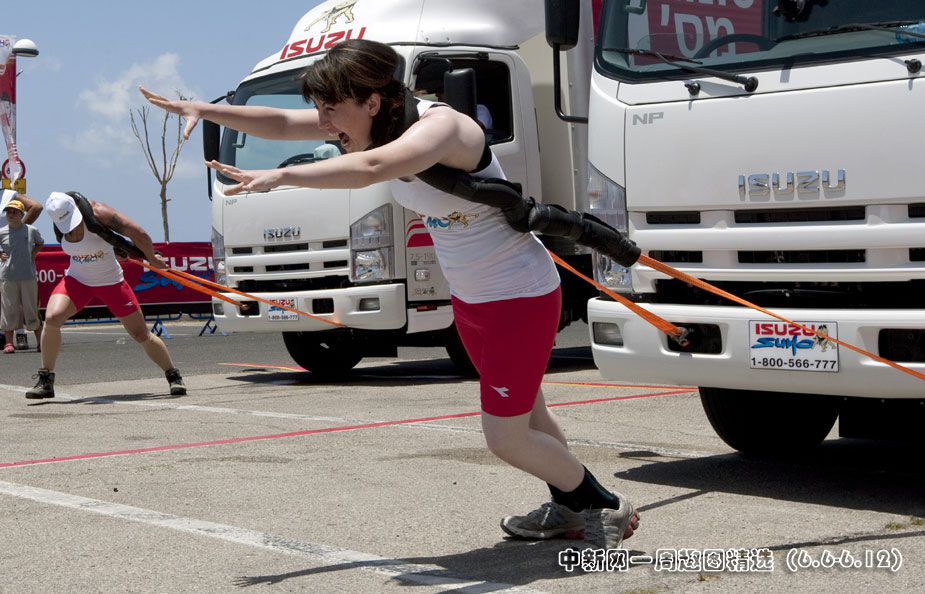 6月8日,以色列在海滨城市特拉维夫举行了拉卡车大赛。比赛要求将一台7.5吨的卡车拉到30米以外,用时最短者为胜者。该项赛事不但吸引了世界上众多男性大力士,更有许多女性大力士出战。图片来源:中国新闻网>>点击观看详细内容