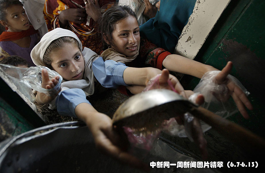 周四(10日),在巴基斯坦伊斯兰堡的Sufi shrine Beri Iman食品分发中心,孩子们手托塑料袋接收捐赠的大米。